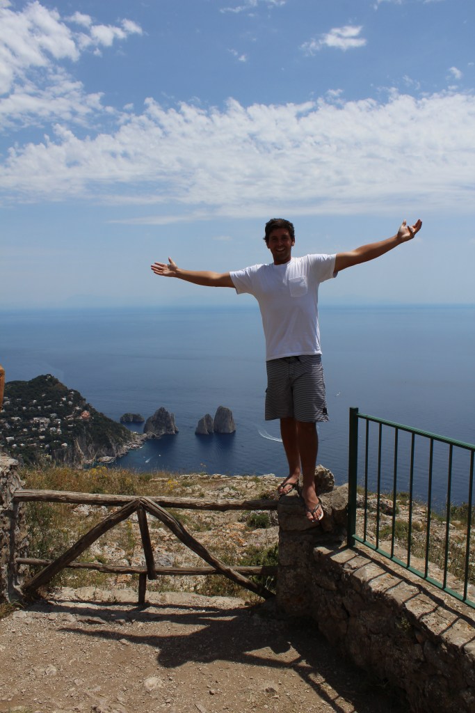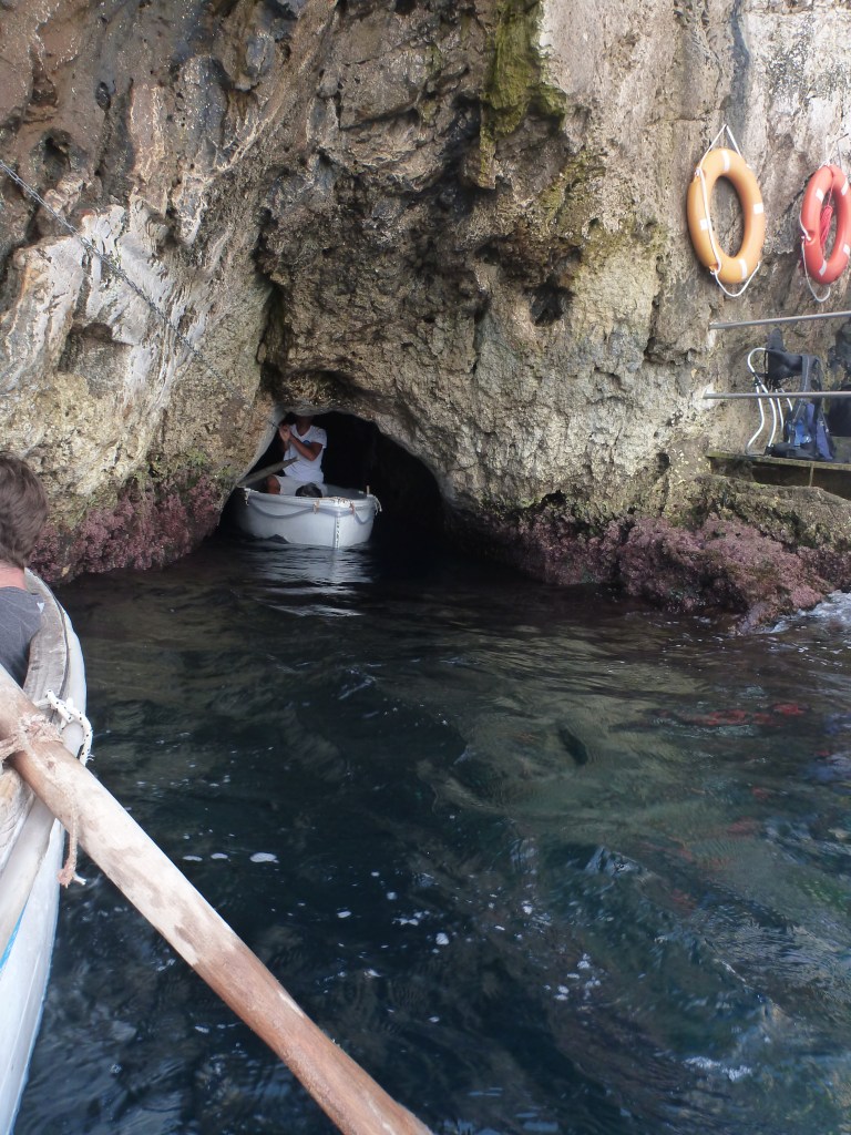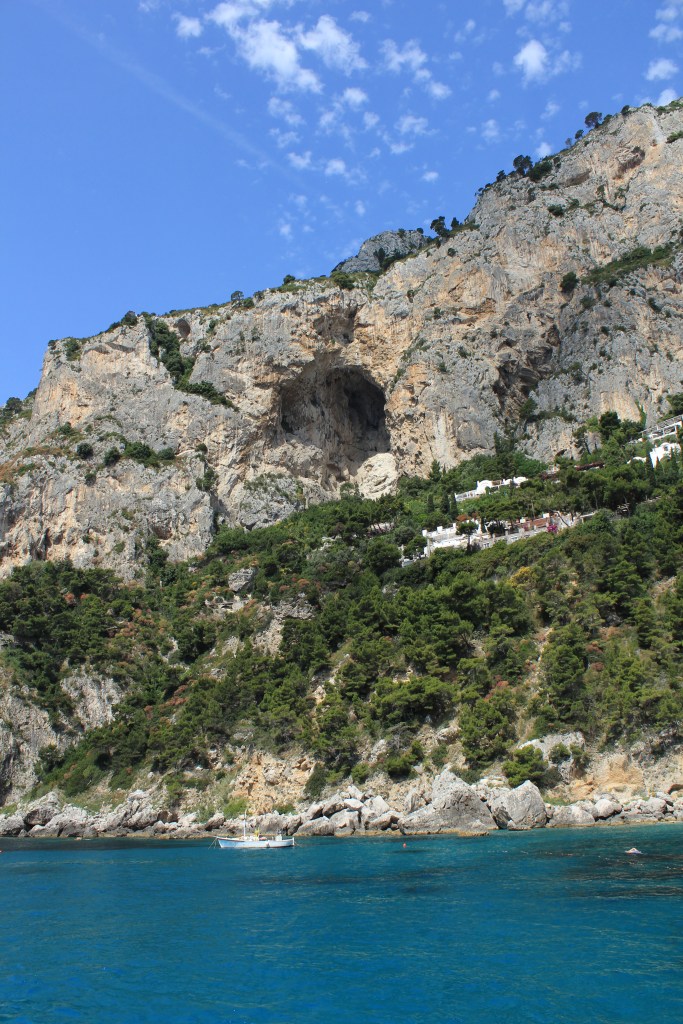 On route, we stopped at an opening in a rock wall that was the entrance to the famous Blue Grotto. For €5, we jumped onto a smaller boat awaiting our turn to enter. Watch your heads! As the waves dip, the boat is able to slide under the low lying rock formation where you are greeted by this amazing blue glow. The inside of the cave is filled with the voices of singing Italian men. For an extra couple of euros, you can jump into the waters for a swim which all the boys did! Then it was time to duck our heads as we exit the blue grotto and continued on to Capri.