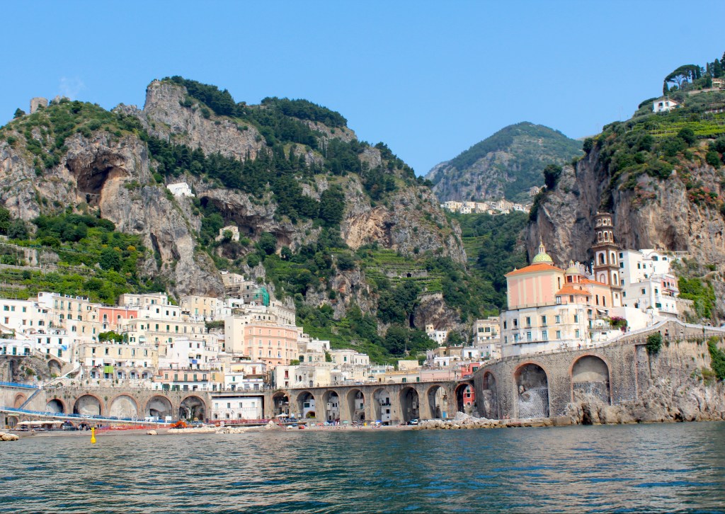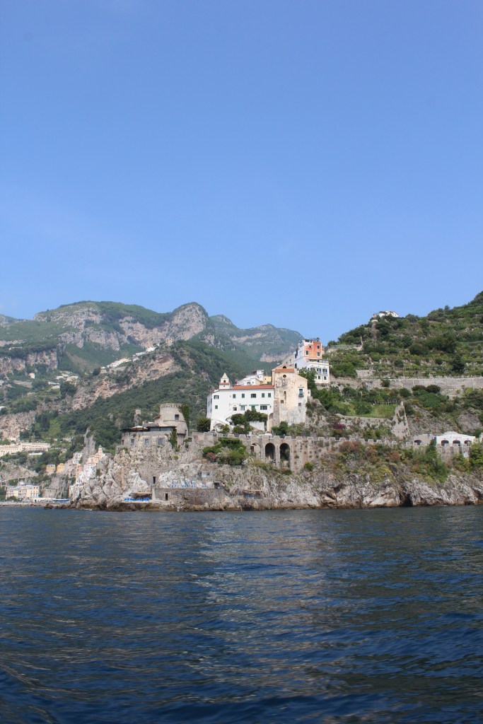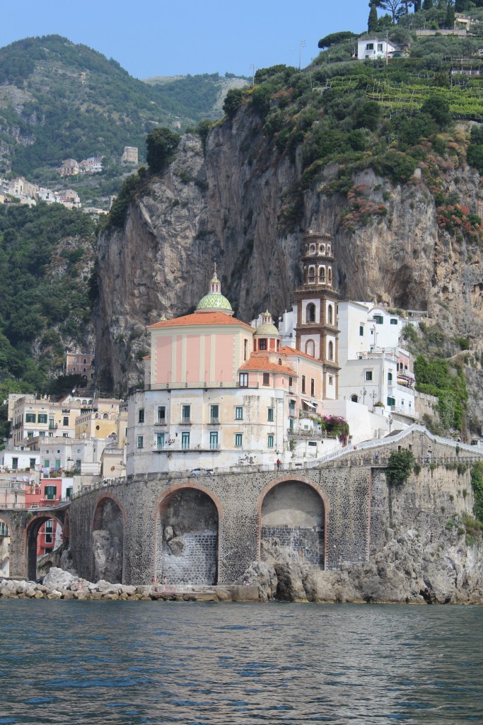 Our final day on the tour had us cruising in the bus along the spectacular Amalfi Coast Road leading from Sorrento. One of the most scenic roads I have ever been on. We almost screamed as our highly skilled driver navigated a bus almost too large for the roads through tiny, almost one-way streets with a sheer cliff drop next to us. The views almost made you forget about the danger! We joined a boat cruise down the coast, past Positano and Amalfi where our guide pointed out houses who belonged to the likes of Sophia Loren & Gina Lollobrigida, Italian TV celebrities I grew up with – although not many others knew who our guide were talking about.