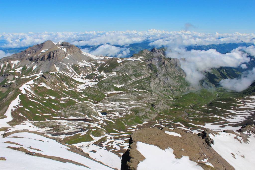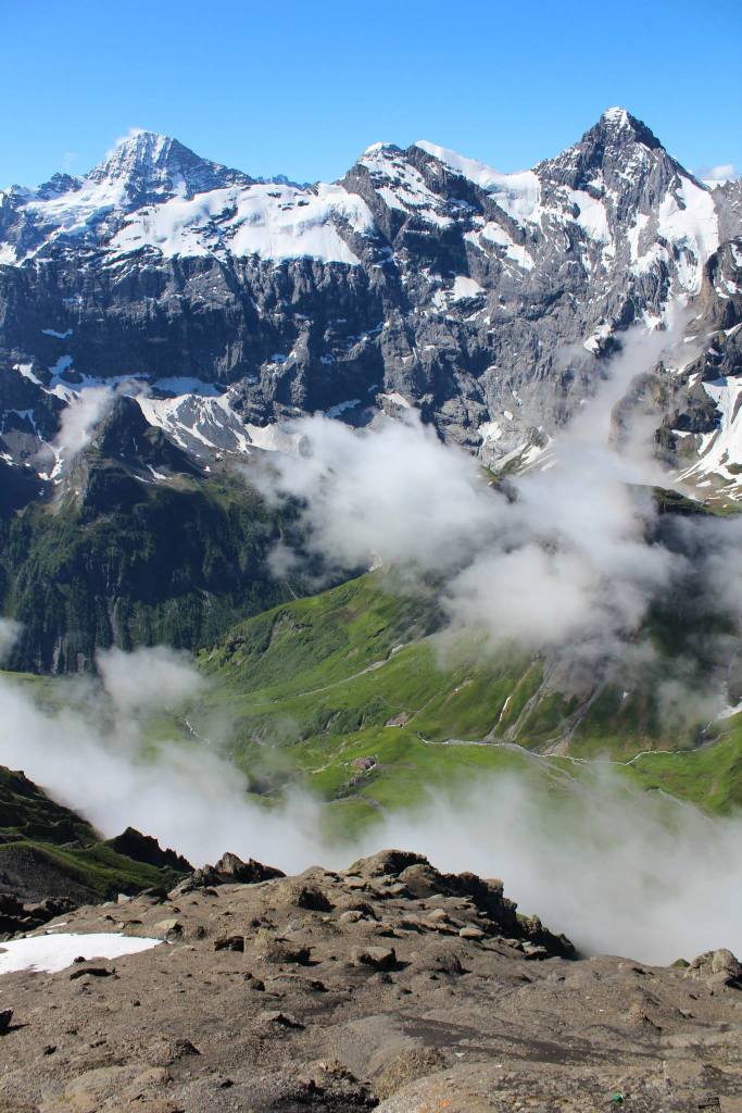 On the morning we were due to leave Lauterbrunnen to head to our next Switzerland destination, we awoke to beautiful clear blue skies. Wade really wanted to skydive in the Swiss alps & we also didn’t get the chance to head up to the mountains. Our busabout guide called up Outdoor Interlaken and confirmed that sky diving flights would go ahead so we decided to skip the bus and spend an extra day in Lauterbrunnen, Rhiannon joining us. As we were up early and their skydive wasn’t until the afternoon, we took the cable car up to the town of Murren for a wander before proceeding to the summit of the Schilthorn which provided the most beautiful views – we were truly lucky with the weather!!