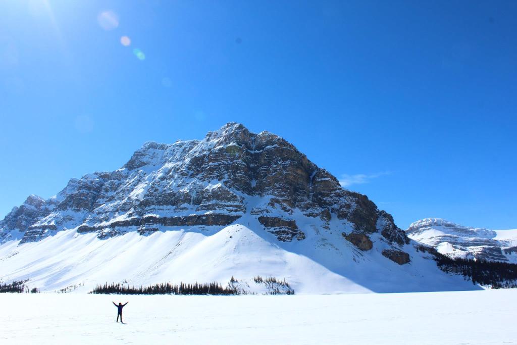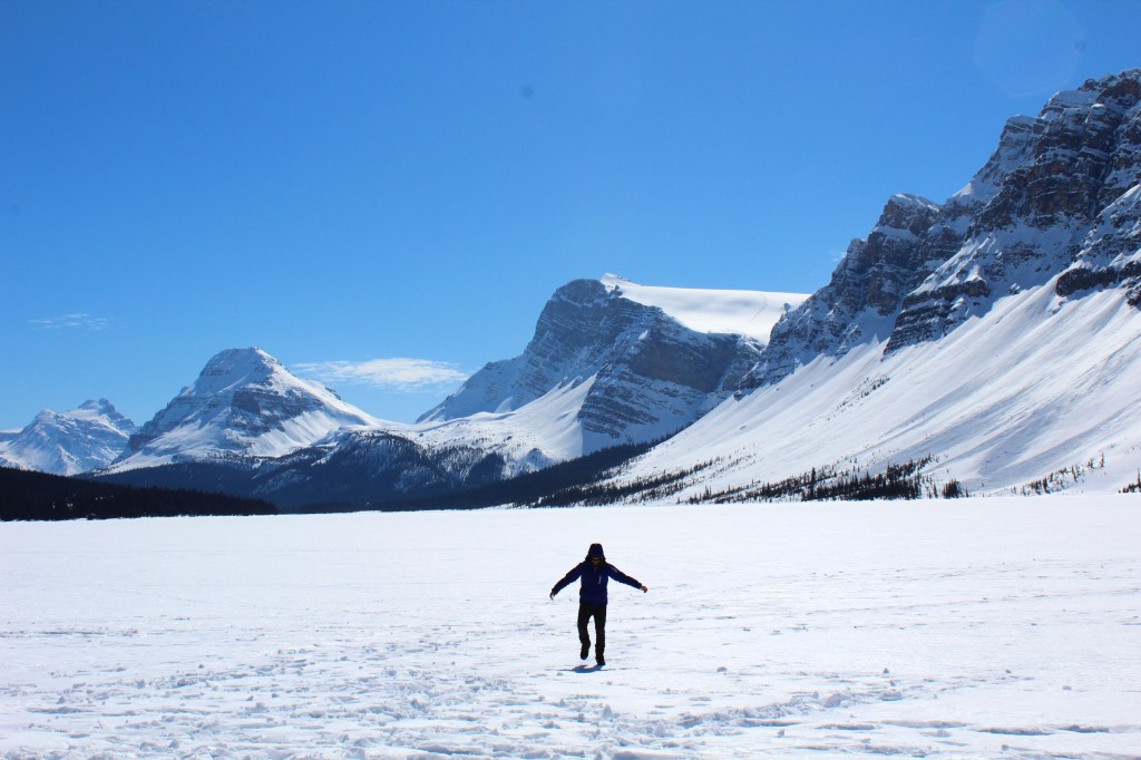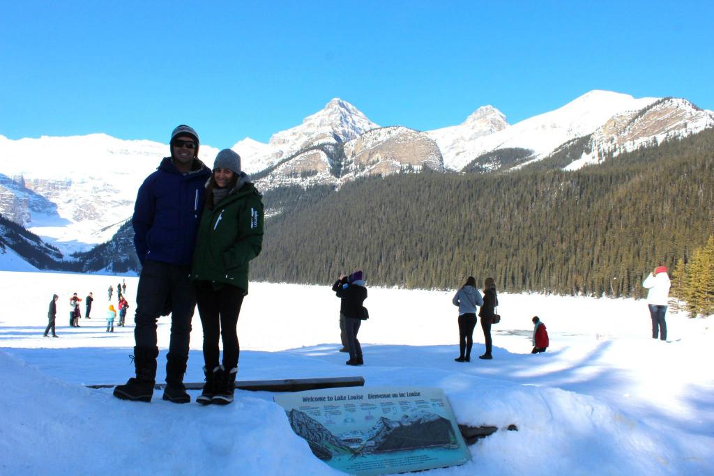 Our first stop was the stunning but frozen Lake Louise! It was amazing to see where the turquoise lagoon once stood was now a snow-covered field for people to explore.