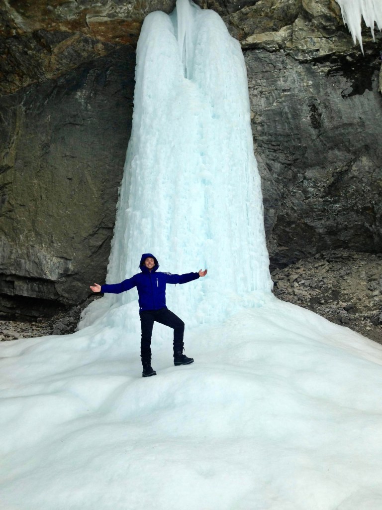 John led us to the side of the road, assumably where a guardrail would be and we all looked down at the snow covered decline. There didn’t appear to be any signs or paths outlined like the other walks. John smiled at us, then jumped and slid down, making his own snow slide to a non-existent, snow covered path down below. Laughing, most of the guys followed suit and after some convincing from the others, I sat down on the slope to join in too! We continued along the walk, falling knee deep in the snow with each step we made, watching the dramatic drop to our right. We turned the corner to see something that I had never seen before in my life or even considered could happen! One of the highlights of my trip – a giant frozen waterfall. We walked on the frozen platform and stood next to what would of been the rushing waterfall. Amazing! Note to self: When your tour guide promises something you can’t miss, trust them!
