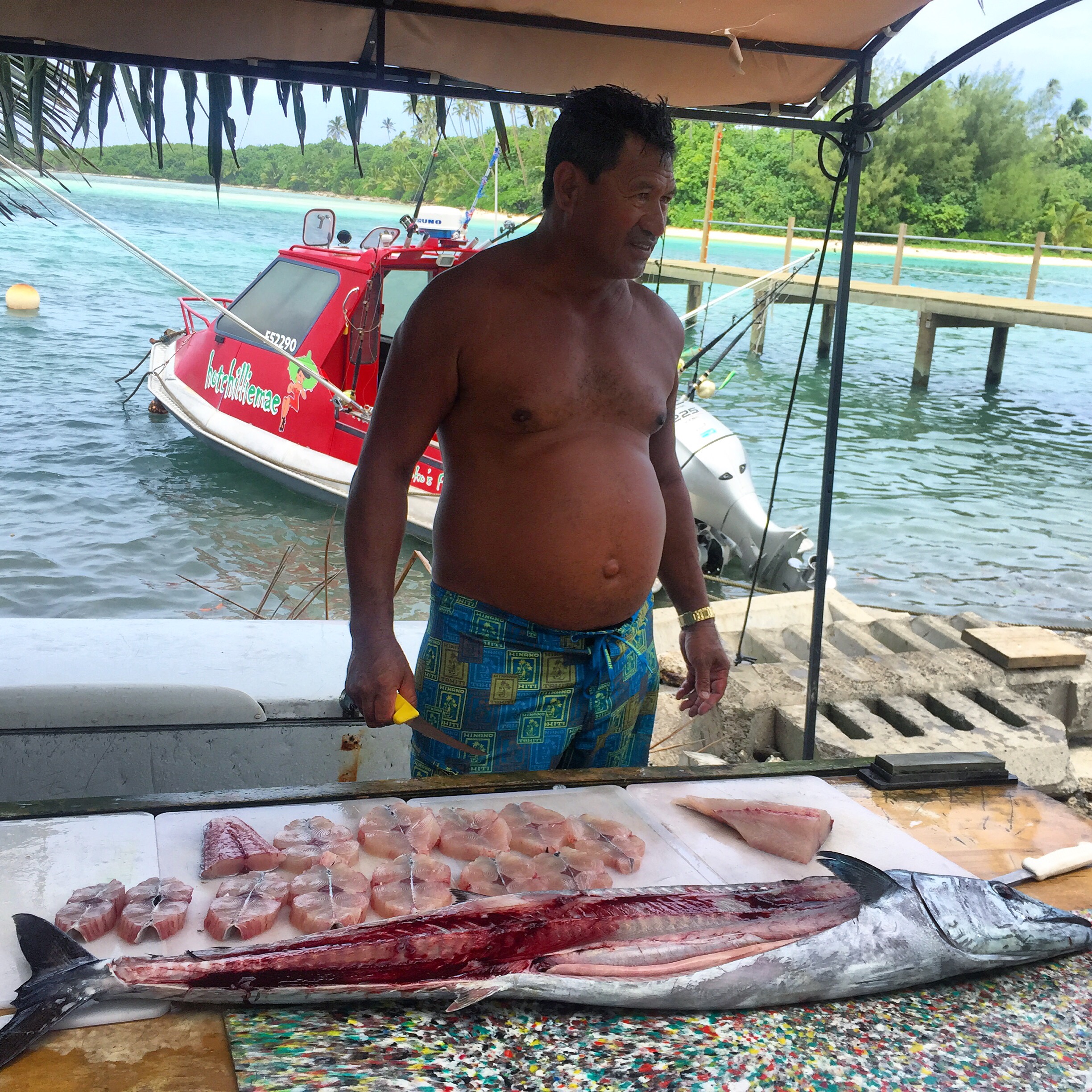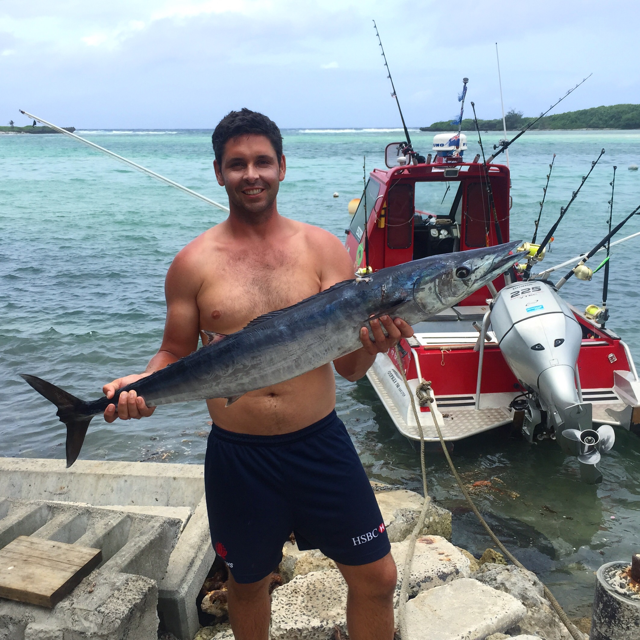 We head to Avana waterfront to Captain Mokos for our booked fishing charter. The swell and waves were definitely around as we drove out the headlands praying the fish would be worth it. Trawling for only 10 minutes before getting onto our first fish, my turn was up. I tied the belt to my waste as Wade helped lift the rod up into the post. I could hardly turn the reel as the fish swam for its life – soon after Wade took over and we landed a beautiful Wahoo! which is the sound we all made as we realised. We got excited for more fish to come but poor Courtney was sea sick soon after as the waves beat the boat around – I surprised myself that I didn’t get sea sick as I usually do. We saw hundreds of flying fish skim along the water before they dived into waves but unfortunately we caught nothing else. Luckily the Wahoo was 12KG, 1.2 metres long and a beauty! Captain Moko cleaned, scaled and filleted one side of the Wahoo which gave us 12 generous steaks + more. We gave captain Moko the rest to enjoy as we had more than enough. Moko tossed the spine & left overs into the water and shortly after two massive giant trevally came to the surface, fighting over the pieces.
