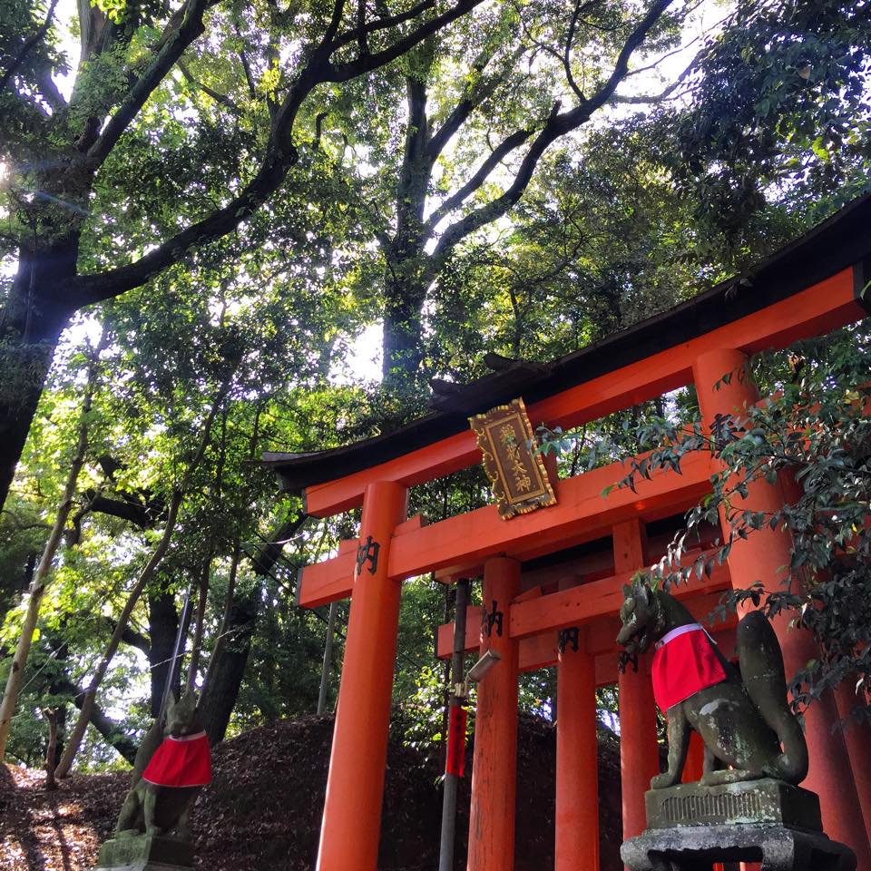 The dark grey clouds lifted away to reveal beautiful blue skies as we approached the shrine. Located in southern Kyoto, Fushimi-Inari is famous for its thousands of bright red torii gates. On entrance, you’ll notice the fox statues which are thought to be Inari’s messengers. Inari, from what I have read, is the Shinto god of rice. The trail, although deceiving at first, leads into the wooded forest of the sacred Mount Inari on a 4km walk up the mountain. The paths are lined with thousands of torii gates so close together that it forms a shaded path which has become the main tourist attraction.