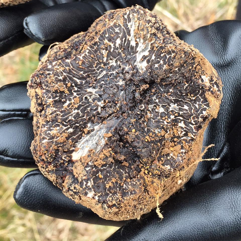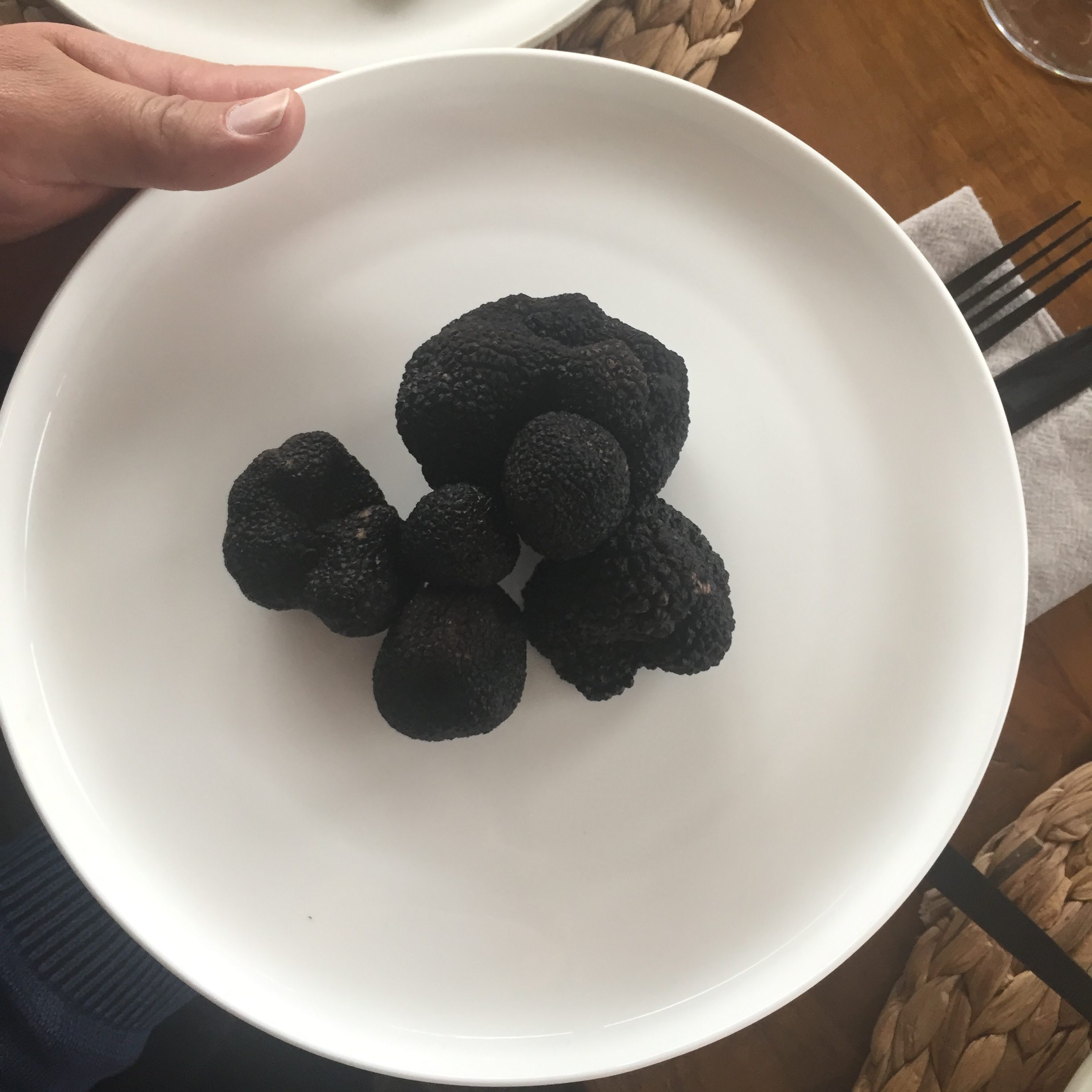 Jason led us outside into the cold winters air but this only set the scene to the awesome truffle hunt ahead. We followed the truffle dog who led us into the fields of over 4,000 oak and hazelnut trees where this special ingredient grows under the ground in abundance. We watched as the truffle dog led with his nose, searching for the smell before advising his owner that this is the spot. Jason would pull out his truffle spade and start the dig, ensuring to go wide as to not break the truffles that are growing underground. The black truffles were huge and were passed around the group for us to feel and smell. We continued our hunt, with many of us having a go at digging our own truffle, before returning to the warmth of the truffle shed for our six-course degustation lunch with matching wines.
