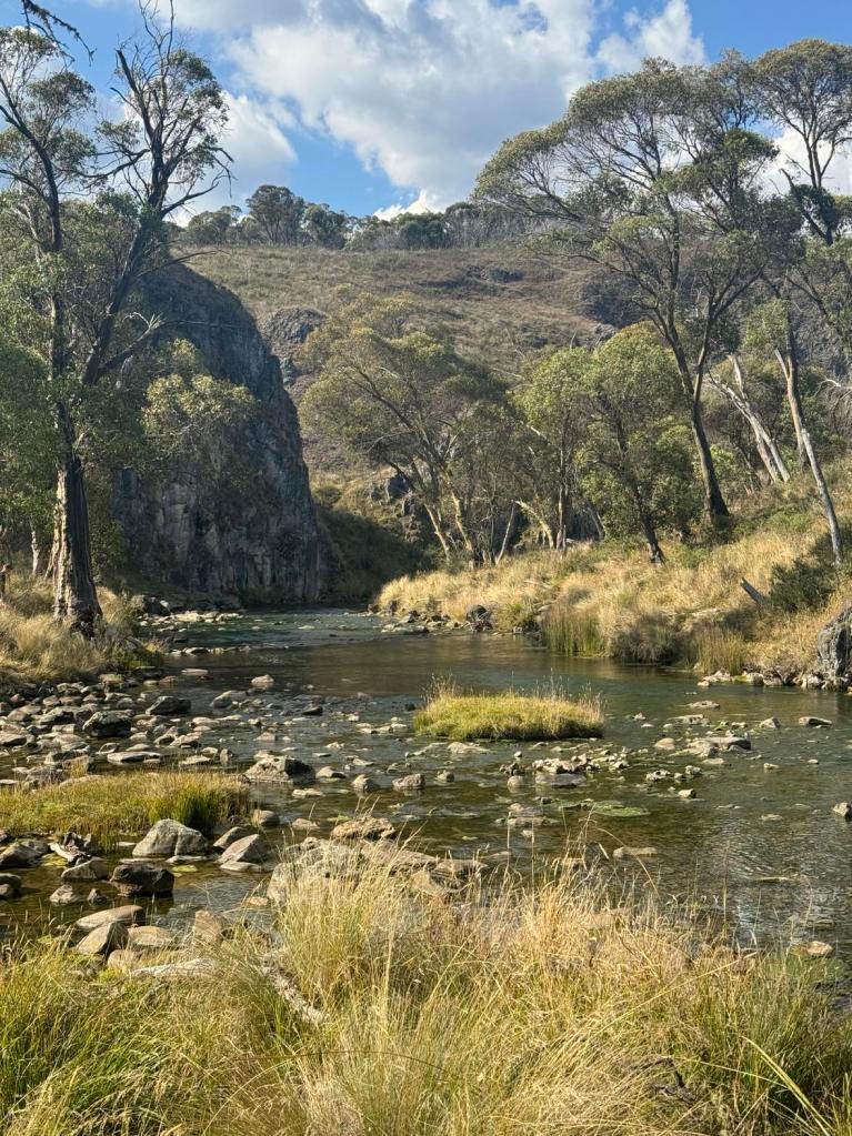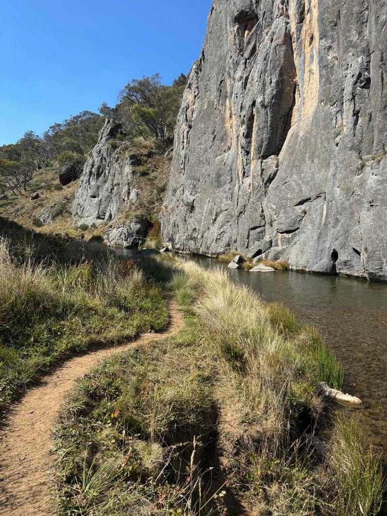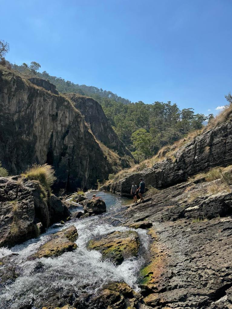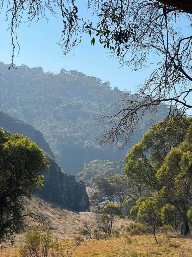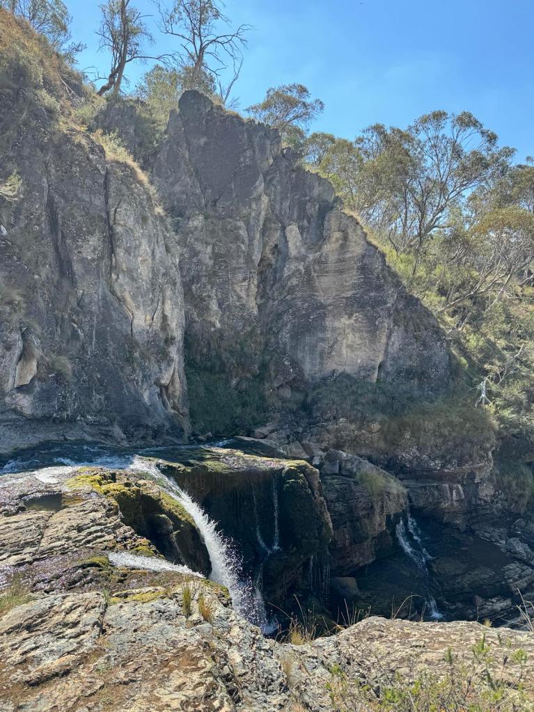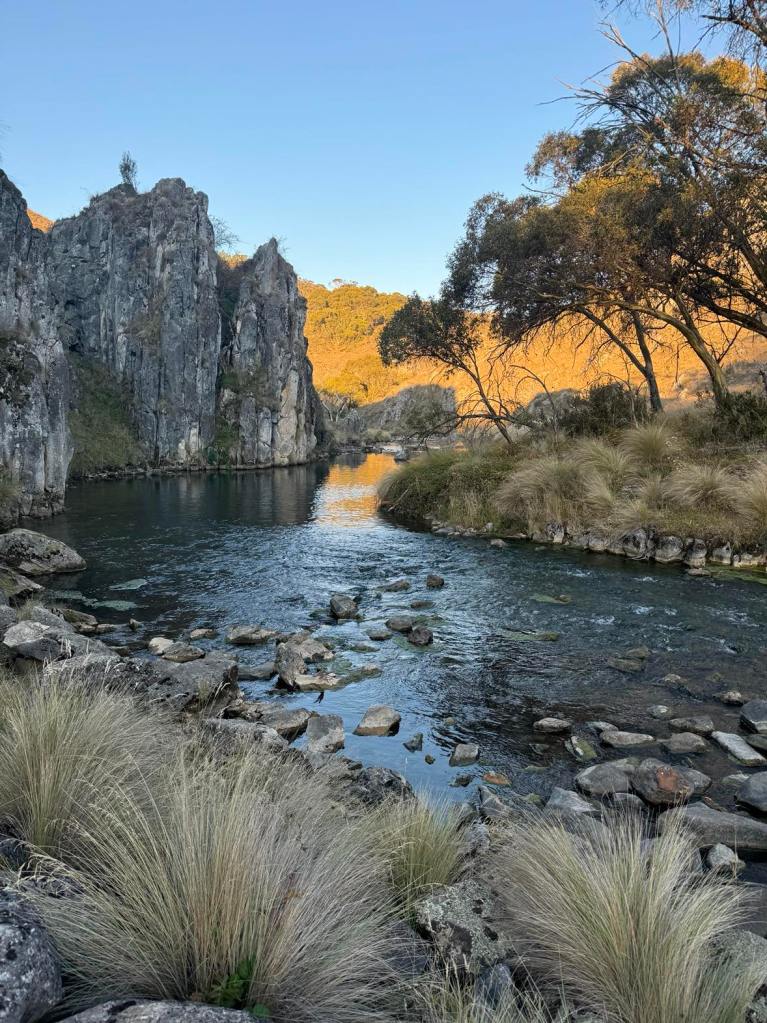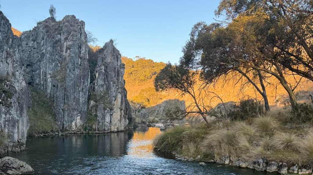 Clarke Gorge walk starts from the Blue Waterholes campsite and heads down to Cave Creek and your first water crossing. The 5km return walk follows the creek downstream through limestone gorges and cave formations towering either side of you as you meander through the many river crossings before arriving at the most stunning waterfall. There are many opportunities for a fly fish or a swim along the way if you can brave the icy cold waterholes. With around 9 river crossings to pass through, it is a good idea to wear water shoes or something you can easily take off and put back on as each crossing can be deep, slippery and not so easy to stay dry. I found my reef boots to be the perfect option. Keep an eye out for wild brumbies and kangaroo’s that frequent the area, along with many bird species and trout. Even though it’s only a 5km walk, it is a grade 5 meaning it does take a lot longer than a usual hike of that distance due to the amount of water crossings. Whilst there are no real steep climbs, there is a (optional) scramble down to the bottom of Caves Creek waterfall / Cooleman Falls which isn’t signposted but totally worth it for the waterfall swim. It also made the perfect lunch spot with stunning views down Wilkinsons Gorge.