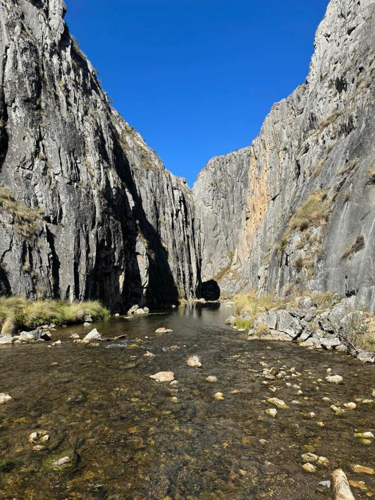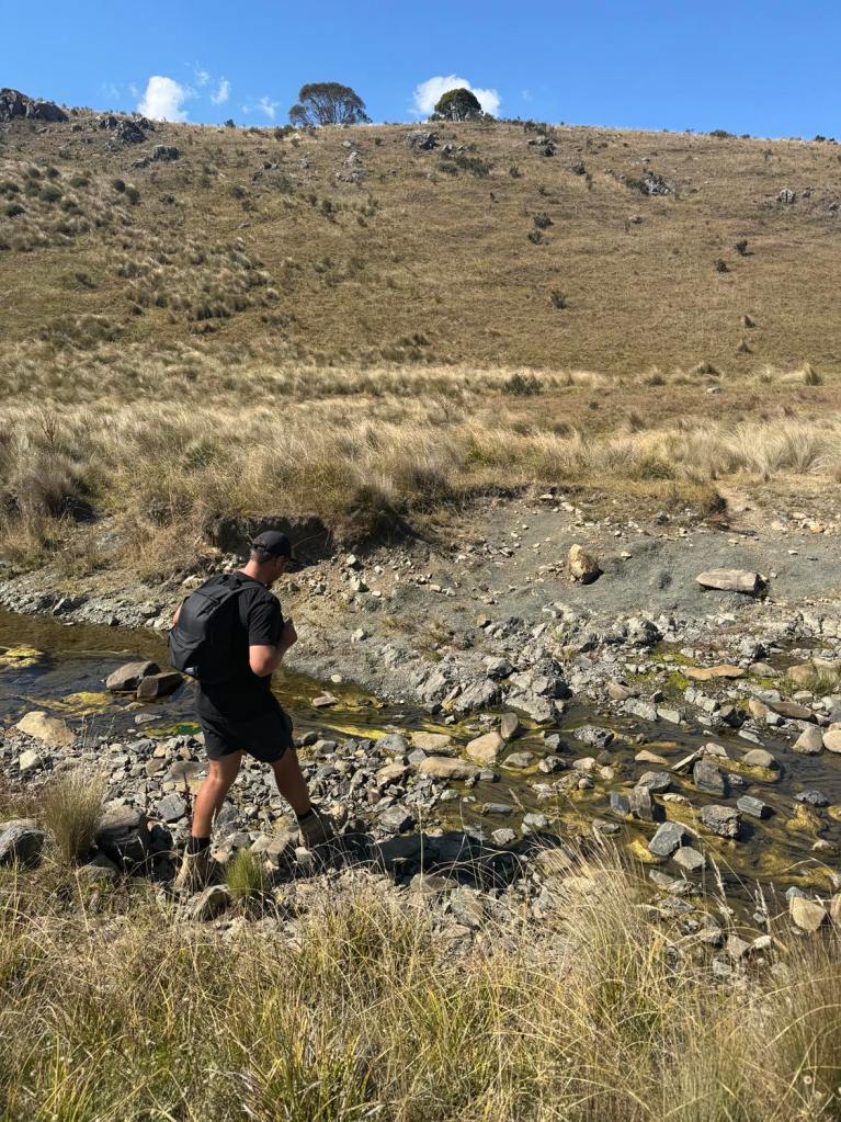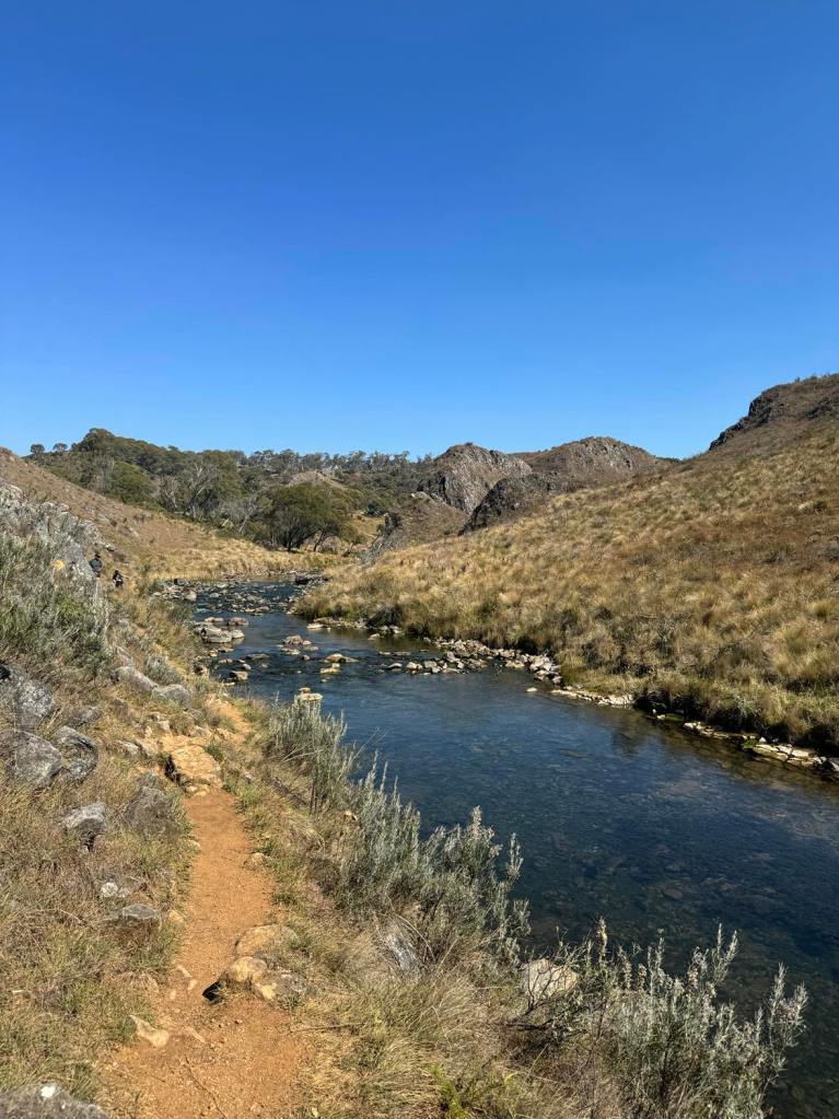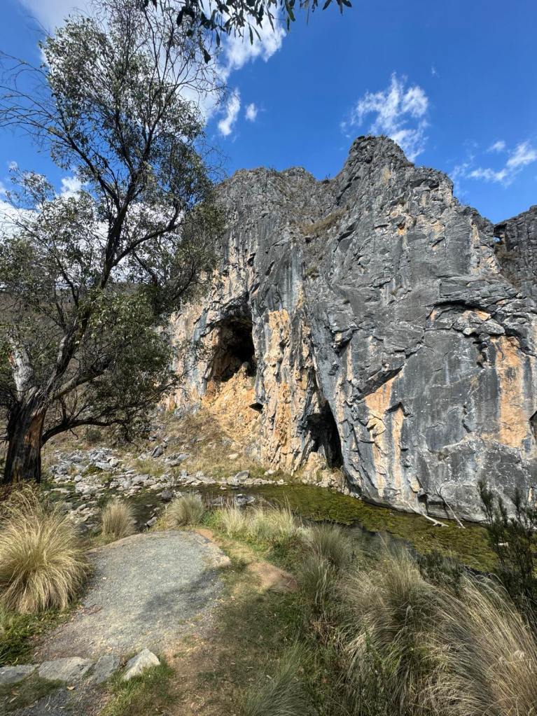 We set off from Magpie Flats campground and head up hill, as we were told it would be easy going this way instead of from blue waterholes. The beginning of the track leads through grassy fields. Keep an eye out for snakes and brumbies! The trail leads through dry creek beds. No wet shoes required. It won’t be long and you can see down Nichols Gorge to the left, resembling scenes from Lord Of The Rings. We continued straight along the signposted walk, meandering our way up to the top of the ridge where we spot our first brumbies on the walk. We sent up the drone and the views were amazing. We did sadly come across some brumby caucasus that seem to have been long gone. As the walk gets closer to Nichols Gorge, you’ll find a rocky cliff in which you have to scramble down to reach the bottom and it’s where you’ll find the first cave – Cooleman Cave. Grab your head torch as the cave is dark and damp and seems endless. We walked as far as we felt comfortable before turning around. As you enter back into daylight, you’ll be met with a fork in the road. Turning left would lead you through the gorge, back to where you almost started from but the real gem is turning right. From here you are lead through dry creek beds with large limestone cliffs towering next to you. Another pinch-yourself moment. We stopped for lunch and a refuel before continuing on the windy trail. We explored Murray Cave that had two large arches showcasing the beautiful blue sky outside. Not far from here is the Blue Waterholes and the short walk back up to the campsite.